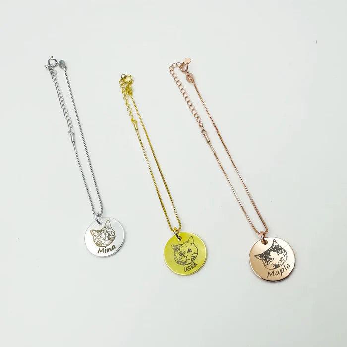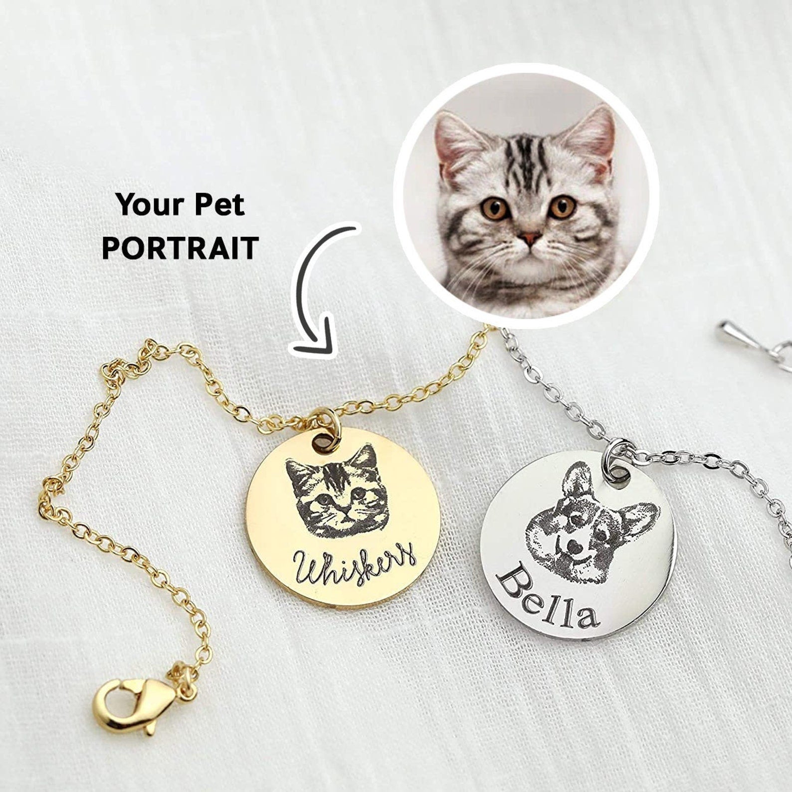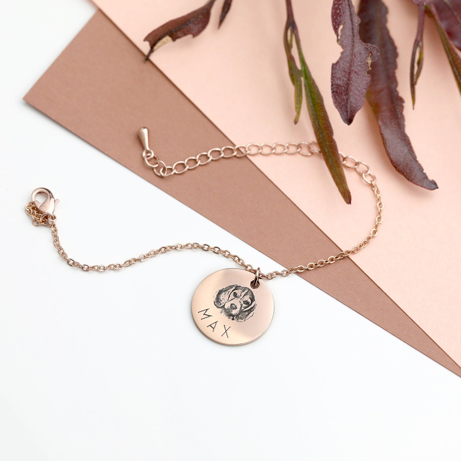They are available in silver, gold, and rose gold. Handmade with a delicate chain and customizable disc charm, this bracelet features a portrait of your pet along with their name or nickname.